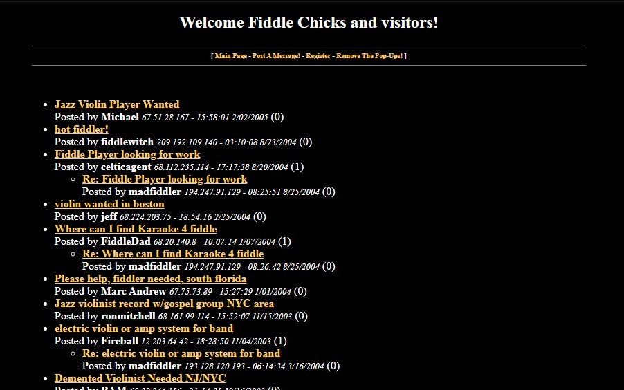 Here are some select screenshots of FiddleChicks.com as it once looked: